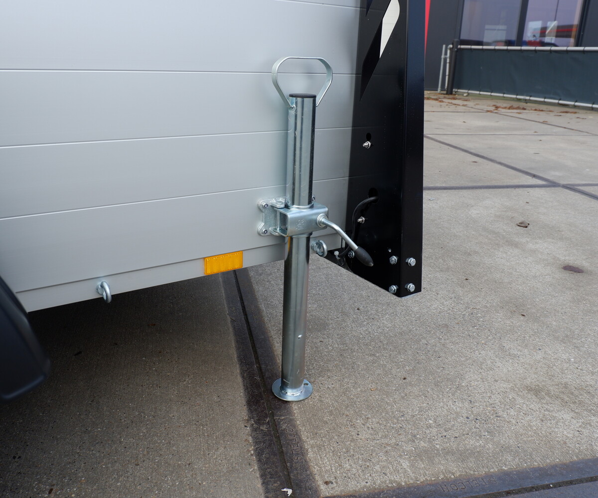 Belangrijke kenmerken zijn de scharnierende achterklep en deksel, uitschuifbare steunpoten en robuuste handgrepen aan de voorzijde. De 12 inch hogedrukwielen (900 kg per wiel) zorgen voor stabiliteit, terwijl het moderne zwarte achter portaal en de Ledverlichting rondom zorgen voor veiligheid en een stijlvolle uitstraling.