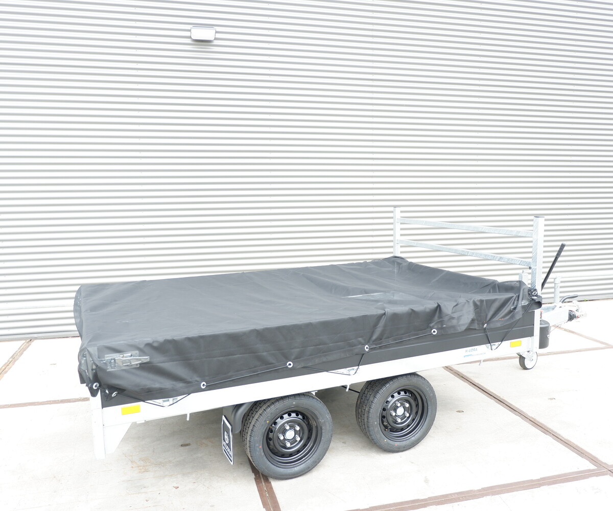 Sterk doek voor goederenvervoer, gemaakt van fijnmazig gaasdoek. Afmeting is 250x130 cm met 20 cm flappen, totale afmeting 270x150 cm met uitgesneden hoeken. Ogen om de 50 cm voor bevestiging. Inclusief elastiekkoord; spanrubbers zijn op aanvraag verkrijgbaar.