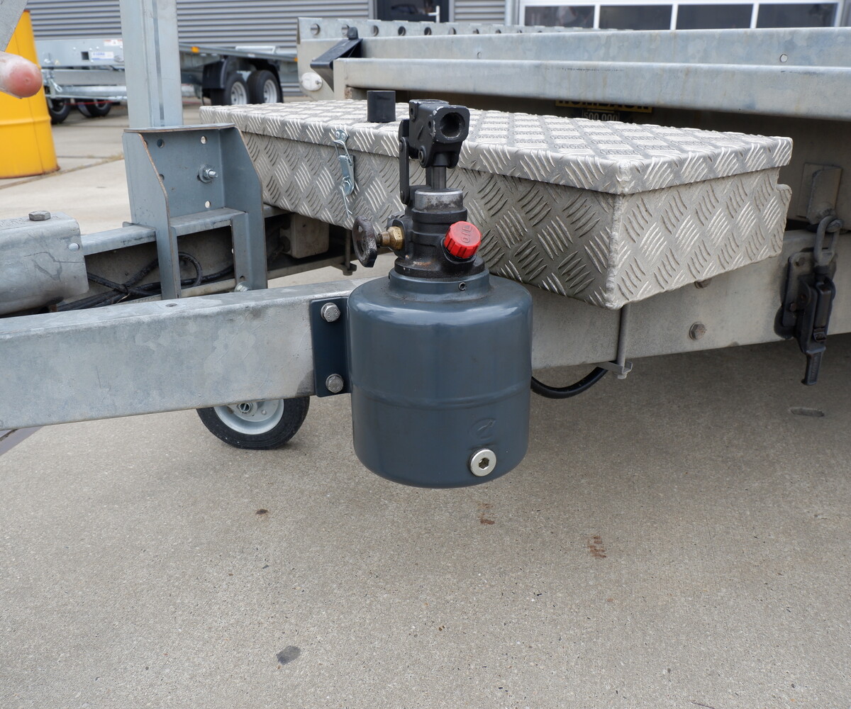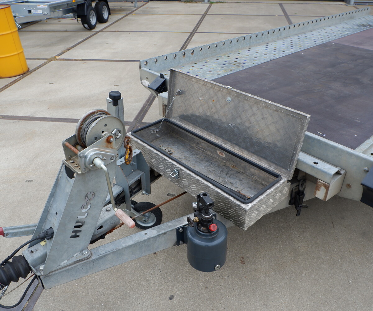 De transporter is kantelbaar en uitgerust met een handpomp, wat het laden en lossen van voertuigen gemakkelijk maakt. Dankzij de twee uitneembare oprijplaten kunt u flexibel werken. Verder is de aanhanger voorzien van een disselkist voor extra opbergruimte, een lier met steun en praktische hamburgerlampen aan de achterzijde voor goede zichtbaarheid.