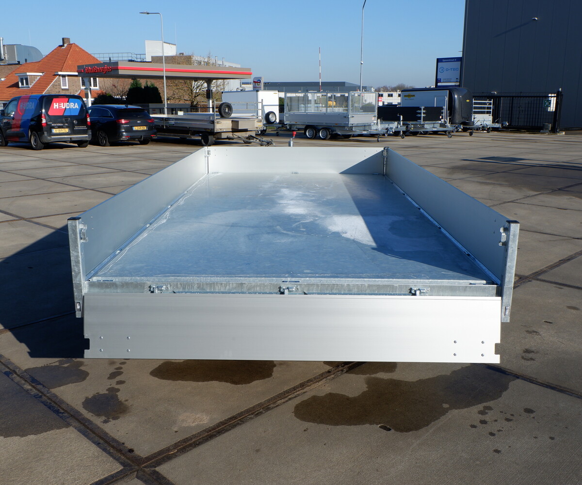 De sterke bindhaken zijn mooi verzonken in de rand van de laadvloer en geschikt voor lading tot 950kg. Ook de sluitingen zijn geïntegreerd in de borden, waardoor ze beter beschermd zijn. Ten slotte wordt de kipper standaard geleverd met 185/60R12 zwarte velgen, sledes om rijplaten in op te bergen en een U-profiel onder het achterbord om rijplaten achter te haken. Daarnaast kunt u kiezen uit een gaffelslot, gaasnet of gaasdoek, opzetborden of loofrekken, zodat deze aanhangwagen perfect aansluit bij uw wensen en behoeften.