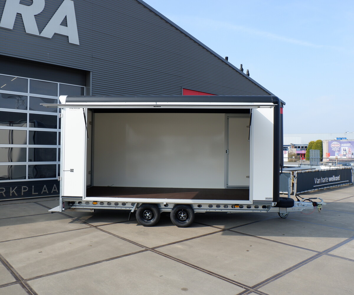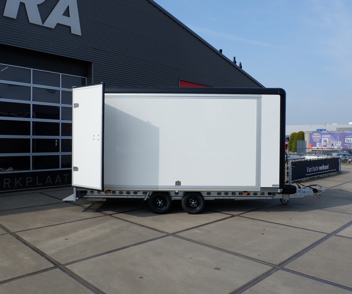Standaard wordt de aanhangwagen geleverd met dubbele achterdeur, maar kan ook geleverd worden met een sterke oprijklep, met een draagvermogen van 600kg. Daarnaast is deze aanhangwagen ook te voorzien van bindrails, steunpoten en zijdeur.