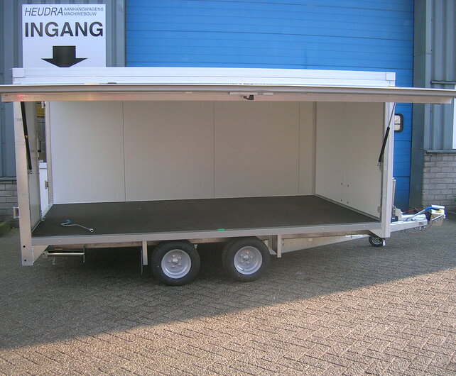 Chat met onze expertsDeze Heudra maatwerk gesloten aanhangwagen is geheel opgebouwd naar wens van onze klant. Met een afmeting van 350x200x150cm en een totaalgewicht van 2500kg, wordt deze aanhanger gebruikt voor het vervoeren van een osmose systeem. Dit systeem word gebruikt voor reiniging van ramen en gevels. De aanhangwagen heeft een vaste sandwich panelen opbouw en is voorzien van een verkoopklep aan de zijkant rechts en 2 openslaande deuren aan de achterzijde. De verkoopklep word ondersteund door gasveren, en is samen met de achterdeuren compleet afsluitbaar.