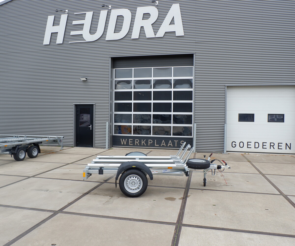 Een oprijplaat voor het plaatsen van de motorfiets bevindt zich in een hiervoor bestemde schacht onder de trailer en kan met slechts enkele handelingen worden gemonteerd.
